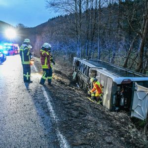 Linienbus mit Fahrgästen stürzt Böschung hinab: Ein Schwerverletzter