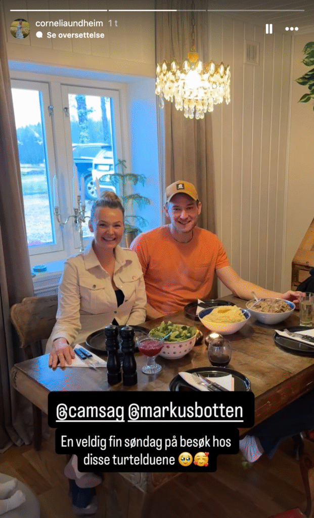 I den første storyen ser vi Cornelia ved middagsbordet sammen med Camilla Botilsrud Sagen og Markus Botten. Smilene er brede, stemningen lun, og bordet bugner av hjemmelaget mat og hverdagskos. Det er ekte søndagsidyll i den varme stua, og teksten sier alt:
