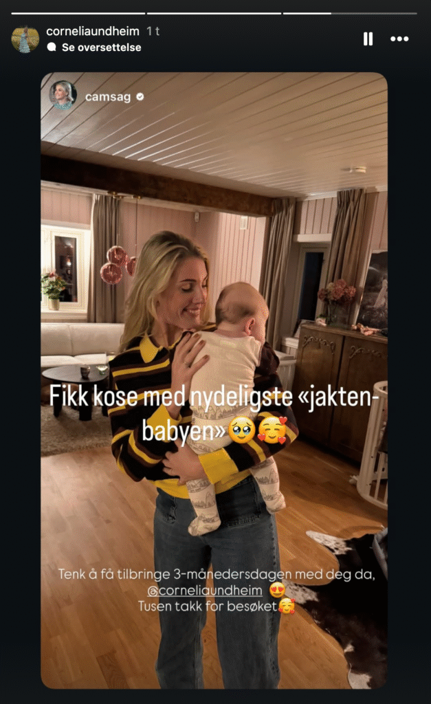 Cornelia står midt på stuegulvet og holder parets lille baby i armene – en rolig, rørende stund med varme blikk og myke bevegelser. Teksten lyder:«Fikk kose med nydeligste ‘jakten-babyen’ 🥺🥰»Og Camilla legger til: