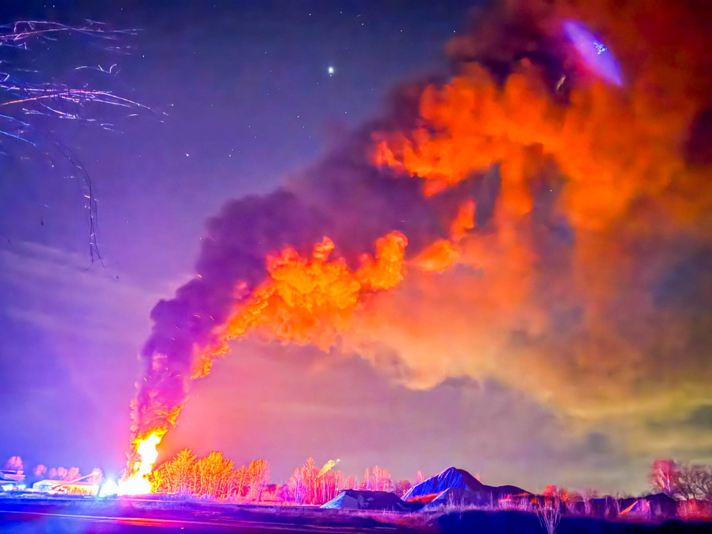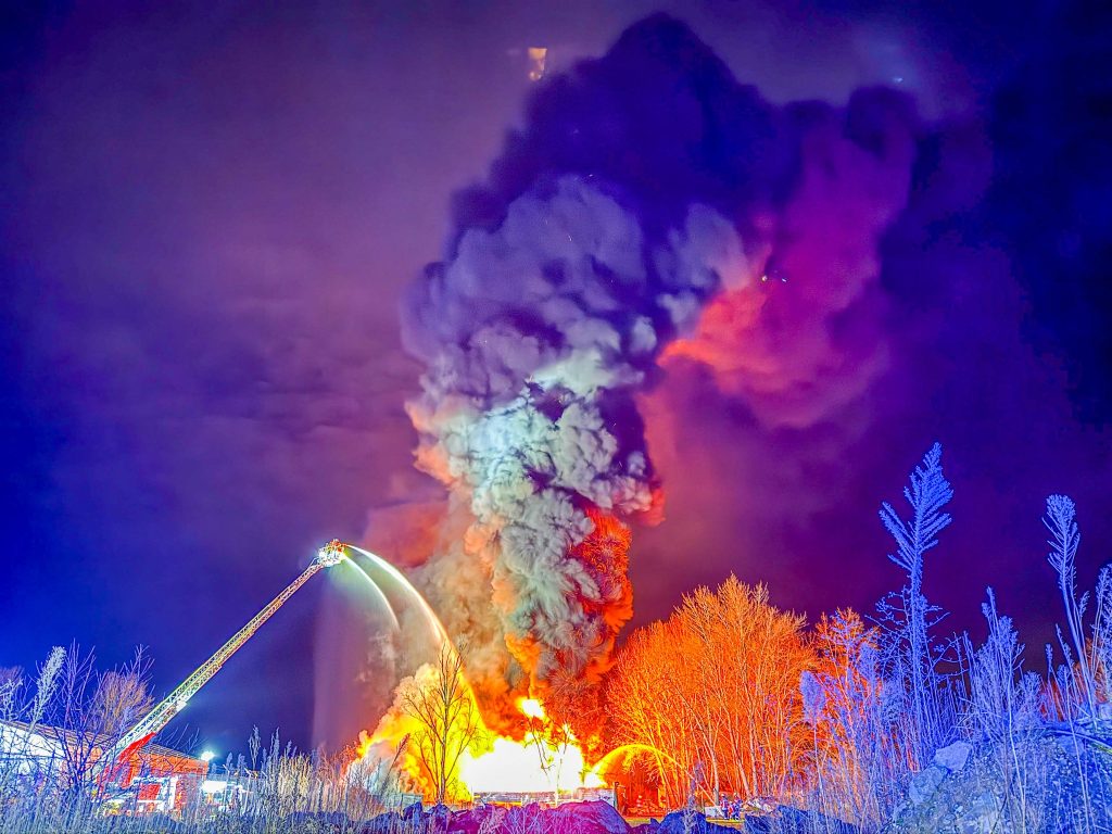 Auf einer Fläche von rund 200 Quadratmetern brannte ein Reifenlager in voller Ausdehnung. Bereits auf der Anfahrt war eine starke Rauchentwicklung sowie ein weithin sichtbarer Flammenschein am Nachthimmel erkennbar.