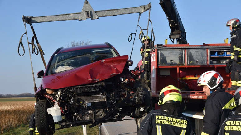Aus bislang ungeklärter Ursache prallten die beiden Pkw auf der Unterwaltersdorfer Straße zwischen Moosbrunn und Unterwaltersdorf frontal aufeinander.