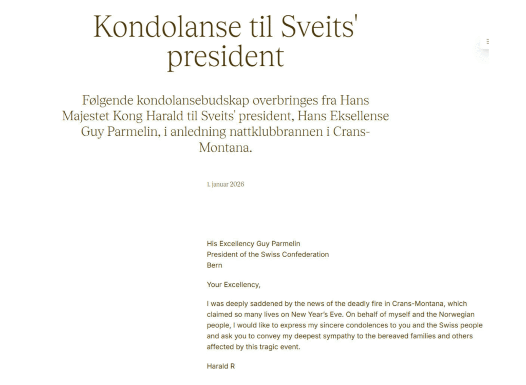 Nå har også Hans Majestet Kong Harald reagert, og valgt å sende en personlig og dyptfølt kondolanse til Sveits’ president, Hans Eksellense Guy Parmelin. Beskjeden, som ble publisert på Kongehusets offisielle nettsider 1. januar 2026, uttrykker både sorg og solidaritet fra det norske folk til det sveitsiske.