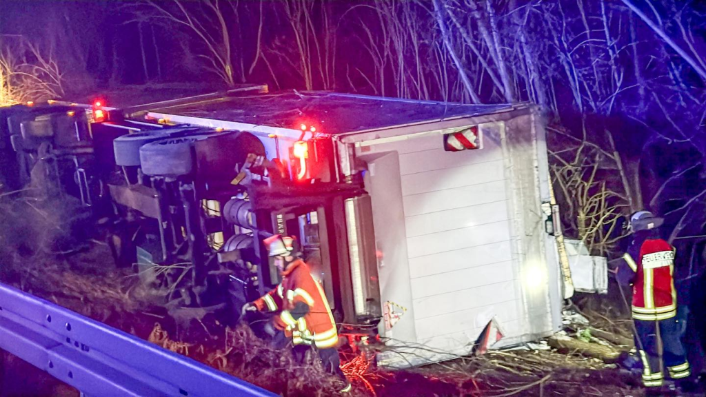 Gegen 1.30 Uhr kam ein Lastwagen aus bislang ungeklärter Ursache von der Fahrbahn ab und kippte neben der Autobahn im angrenzenden Wald vollständig auf die Seite.
