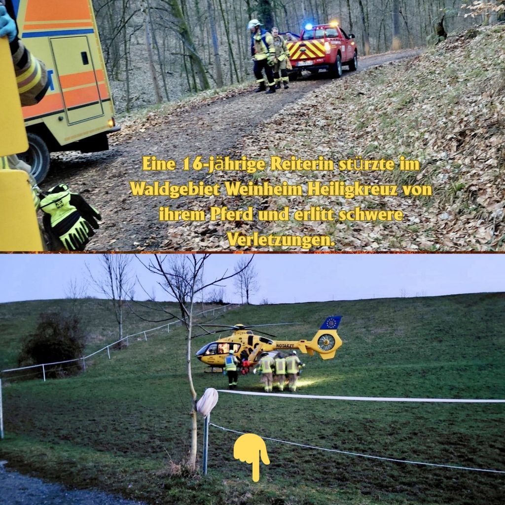 Am Donnerstagnachmittag (26.01.) wurde die Helfer vor Ort Einheit der Feuerwehr Weinheim Abteilung Oberflockenbach gegen 16:45 Uhr gemeinsam mit dem Rettungsdienst zu einem Reitunfall im Bereich Im Wiesental in Weinheim Heiligkreuz alarmiert. Eine 16 jährige Reiterin war im Wald vom Pferd gestürzt und zog sich schwere Verletzungen zu.