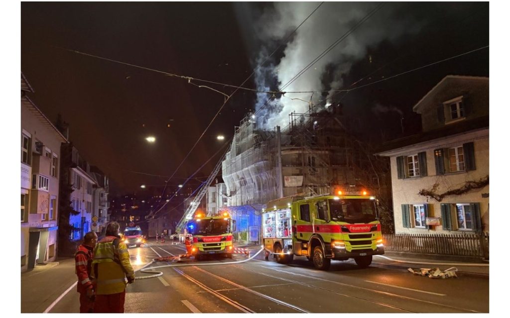 Da sich das Gebäude im Umbau befindet, hielten sich zum Zeitpunkt des Brandausbruchs keine Personen im Gebäude auf. Die Berufs- und Milizfeuerwehr starteten sofort einen Löschangriff mit mehreren Löschleitungen. Um an den Brand heranrücken zu können, öffnete die Feuerwehr das Dach.